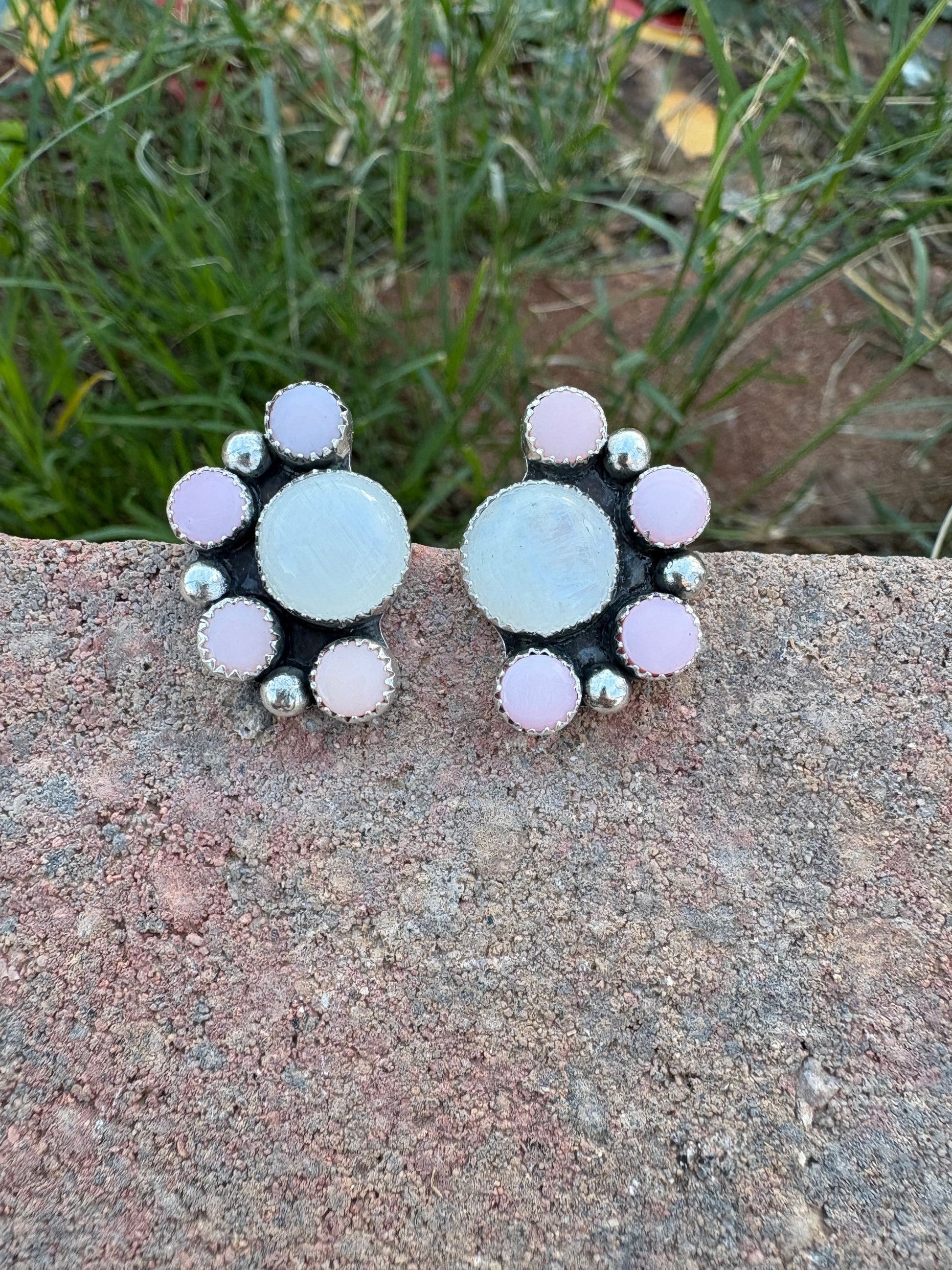 Beautiful moonstones are paired with Queen Conch stones to create these neat half-cluster style post back earrings