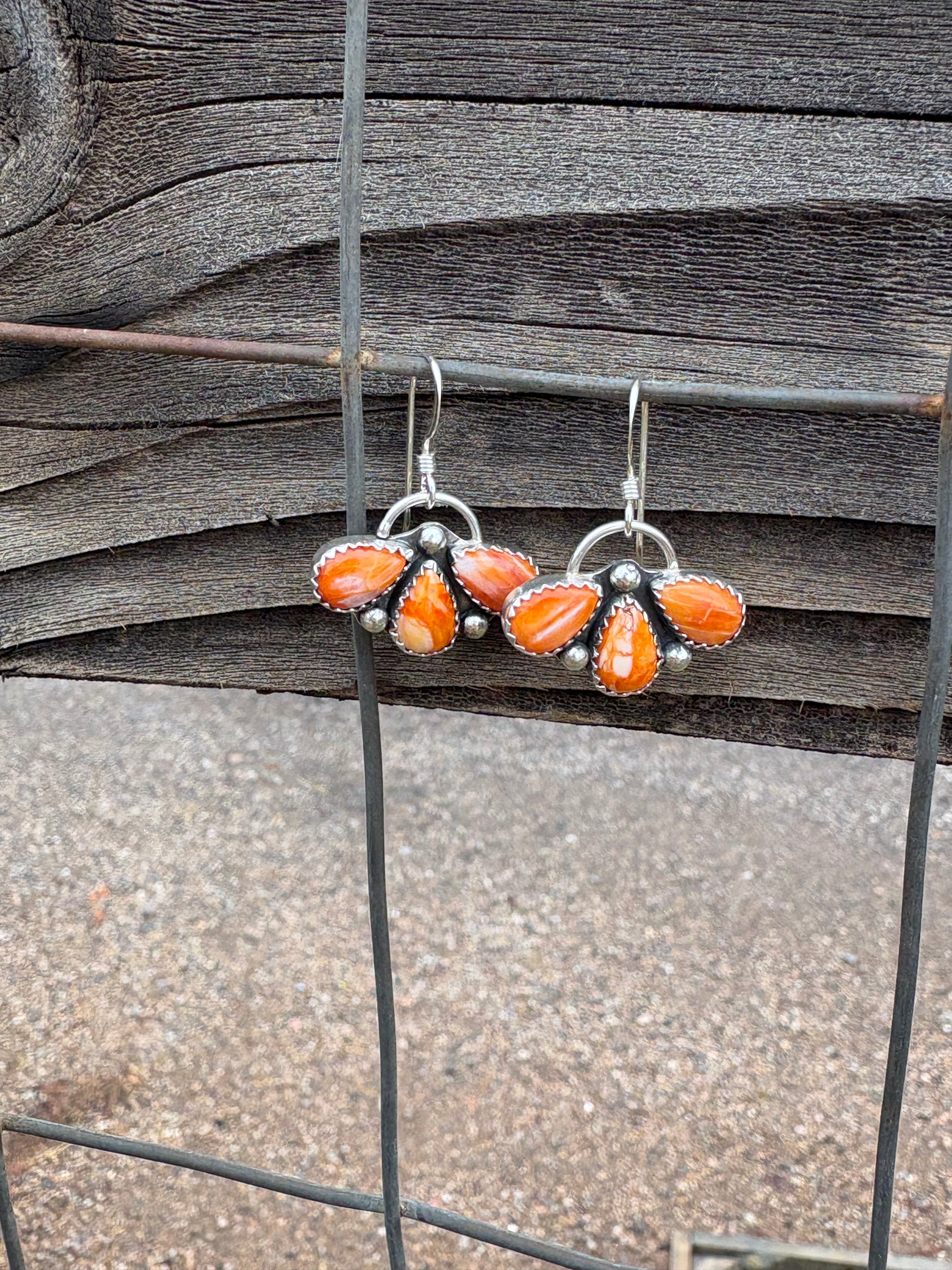 Orange Spiny oyster stone clusters hang from sterling silver ear hooks