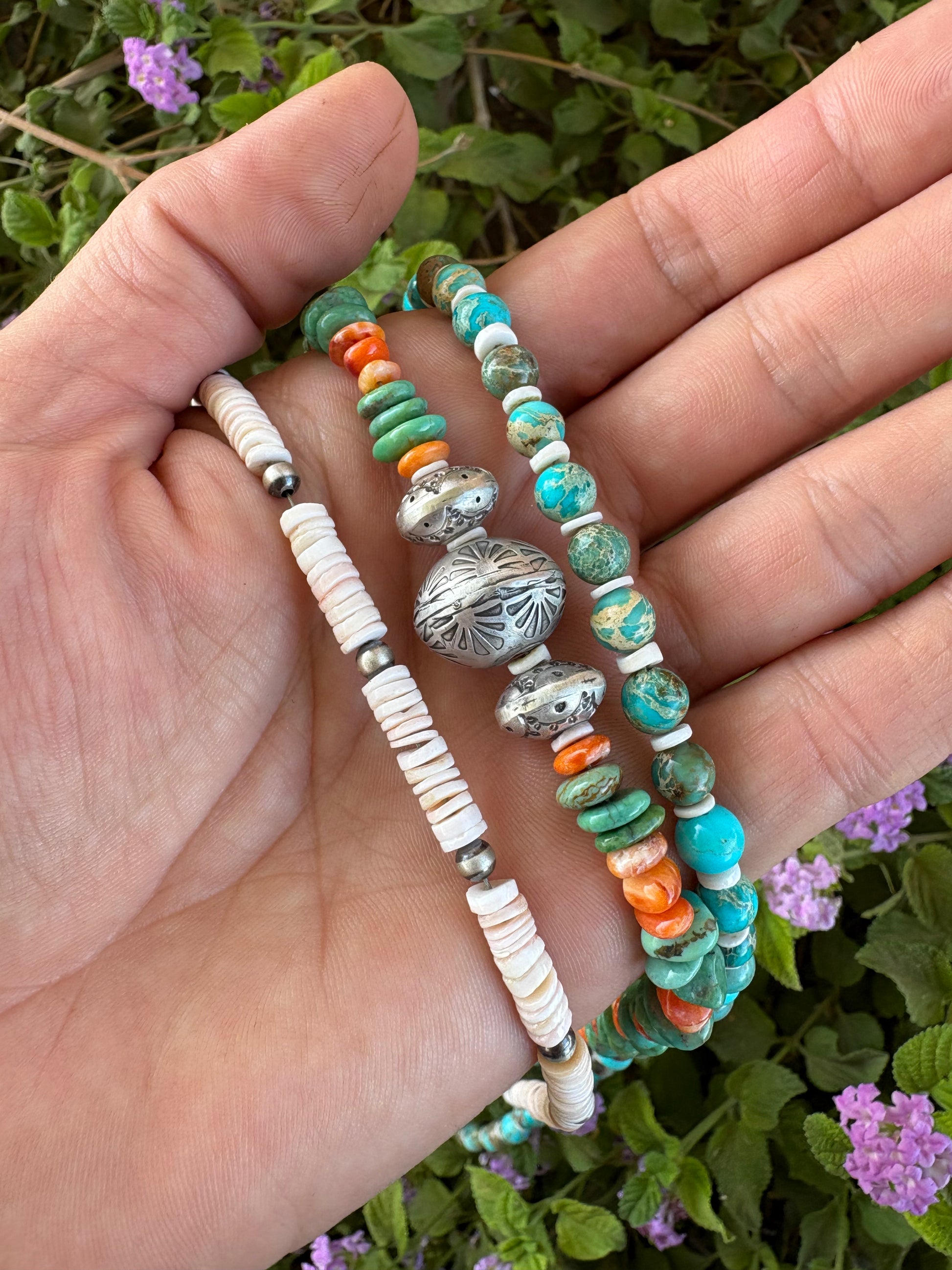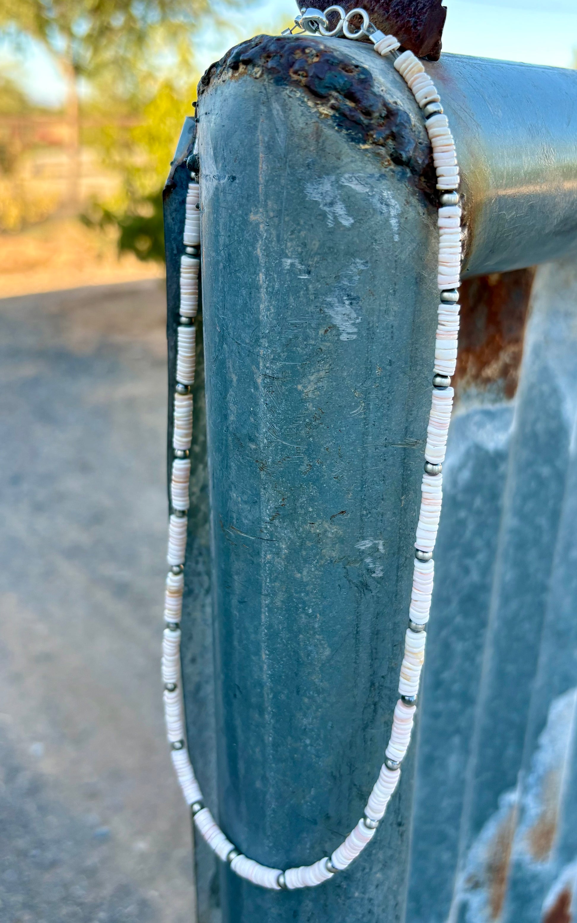 Pink Luana Shell Heishi with sterling Navajo Peals 20” long $65