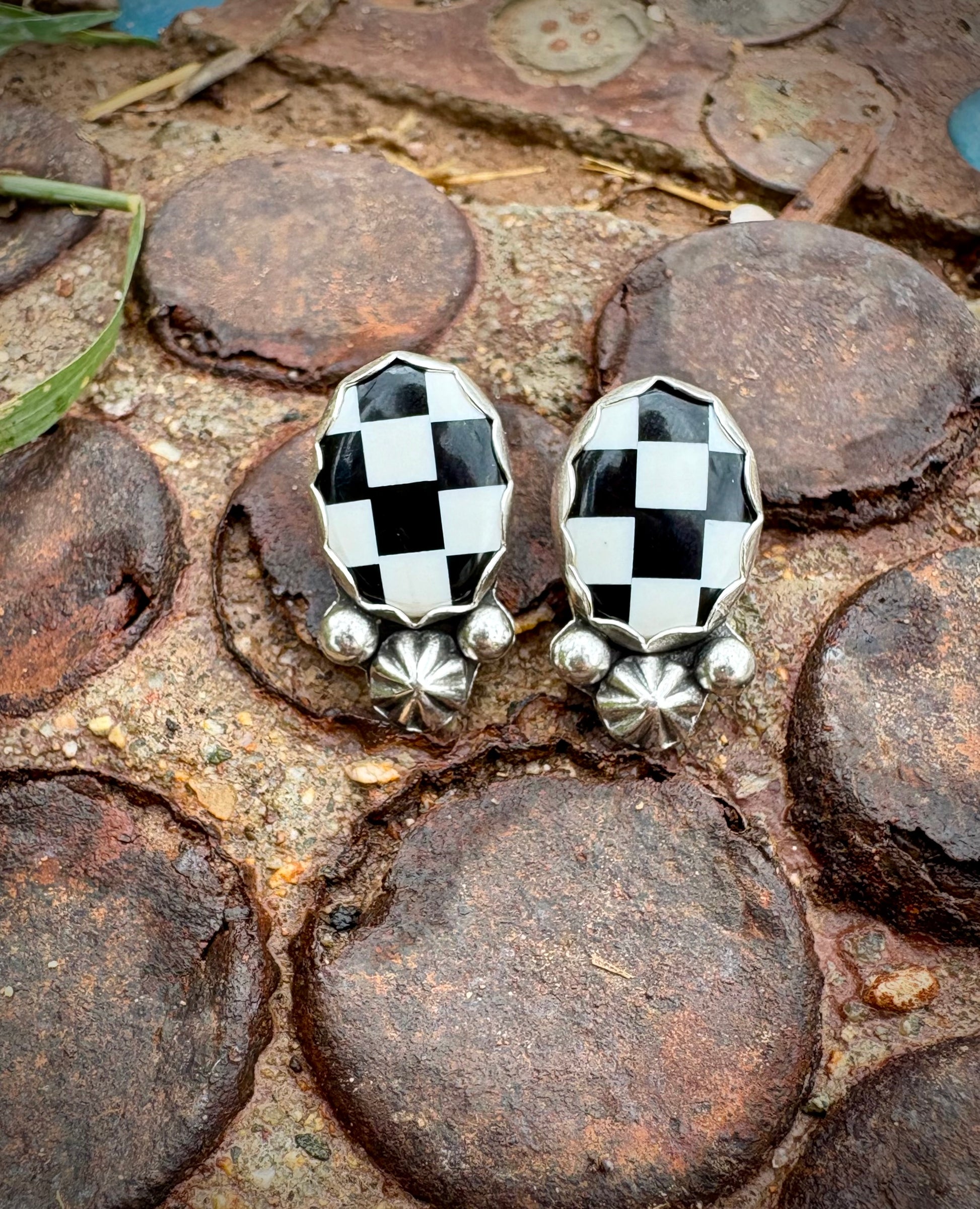 Intarsia checker stones are partnered with fine silver dots and pressed conchos. Post back earrings