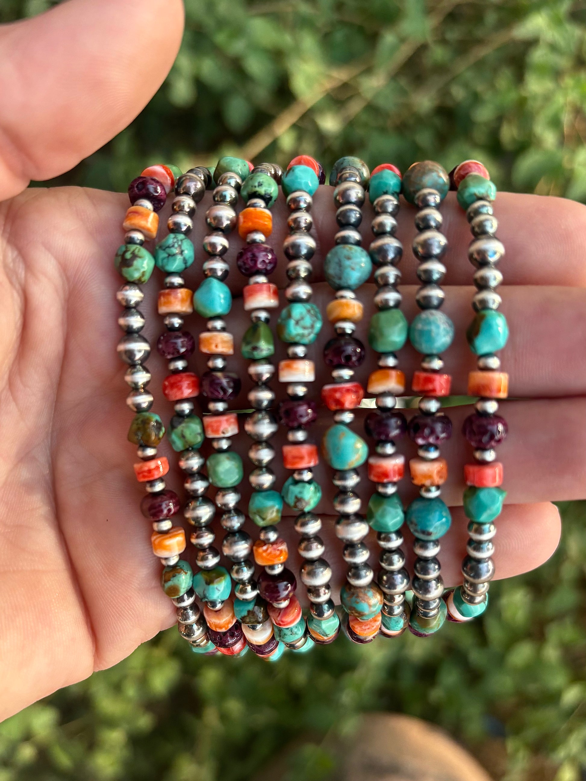 18” with extender Navajo Pearls with Red, Orange and Purple Spiny Oyster and Turquoise spacer beads